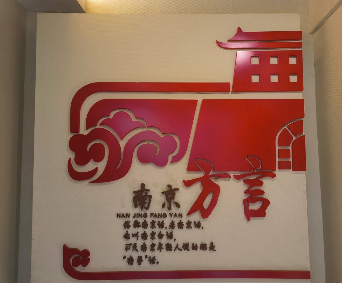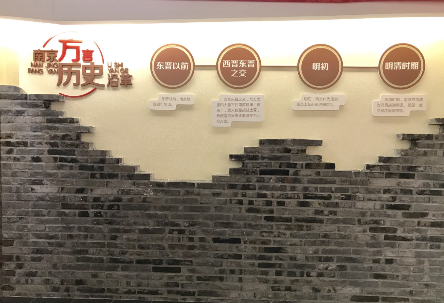 这面墙上介绍的是南京方言历史沿革。地处吴头楚尾的南京,有着悠久的历史,几千年来经历了无数次战乱和兴亡变迁,这种变迁造成了人口的大聚散,自然又直接影响了方言的发展方向。据史料记载,南京方言在魏晋南北朝时当属吴方言,最迟至明末清初已是完全的江淮方言了。