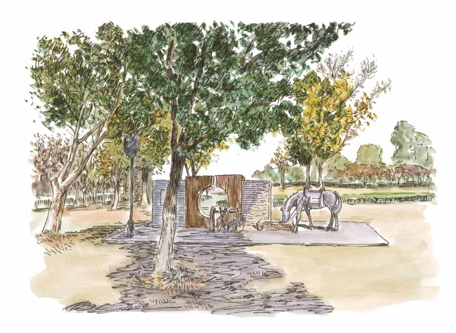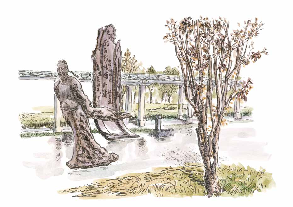 沿着205国道继续往前,与绕城公路交叉路口处建有一绿地公园,名为“建宁公园”,园内有一处景观雕塑——《古道驿风》。雕塑采取去人物化的场景,以一井、一马、一旗杆、一照壁为元素,呈现出“古道西风瘦马”的诗情画意。《古道驿风》雕塑取材地域文化,营造了一种穿越时空感,似乎穿越到中国古代最有名的“新亭”离别地。相传,如今的205国道古称“新亭路”,始建于孙吴,经阴山矶南,穿新林、板桥、江宁镇,直通牛渚(今安徽当涂)、芜湖、宣城。历史上官商贾贩云集,车辆马匹来往频繁。此地也成为古金陵最着名的送别之地,众多文人墨客流连于此,把盏咏叹,留下颇多美谈。在此地,历代名人也写下了许多传世佳作,如刘义庆《新亭对泣》、李白《金陵新亭》等。此景取名“古道驿风”,可谓是西善桥深厚历史文化积淀的生动写照。