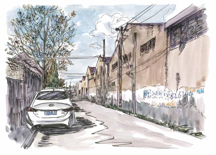 一路向西,途中有一处老旧厂房。一眼望去,厂区占地面积不小,三角形的高大房顶,一浪接着一浪,消失在远方。铁质的窗框经过雨水的洗礼,锈迹顺着墙面留下道道斑痕,记录着岁月的沧桑。不知是谁随手用油漆在墙面涂画几笔,给厂房增添了几分趣味。南京的城郊,留下了许多这样珍贵的旧厂房或仓库,这些工业遗产不仅是反映中国工业文化的一面镜子,同时也延续着城市的历史。